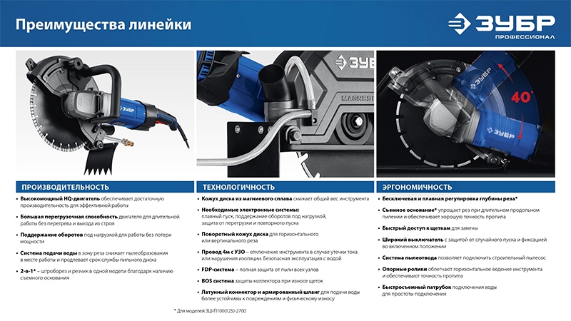 Преимущества электрического резчика по бетону Зубр Профессионал ЗШ-П100-2700 ПСТ: